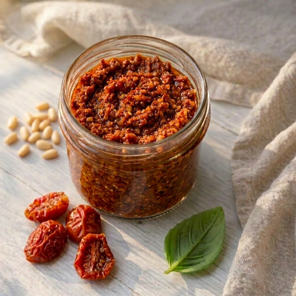 Песто с вялеными томатами — это версия классического соуса для тех, кто любит яркие, насыщенные вкусы. В его основе — вяленые томаты, которые придают соусу глубину, сладковато-пряные нотки и характерный средиземноморский характер. Сыр пармезан добавляет пикантность, кедровые орехи — нежную текстуру, а базилик — свежий аромат. Оливковое масло и морская соль завершают композицию, делая вкус сбалансированным и гармоничным.