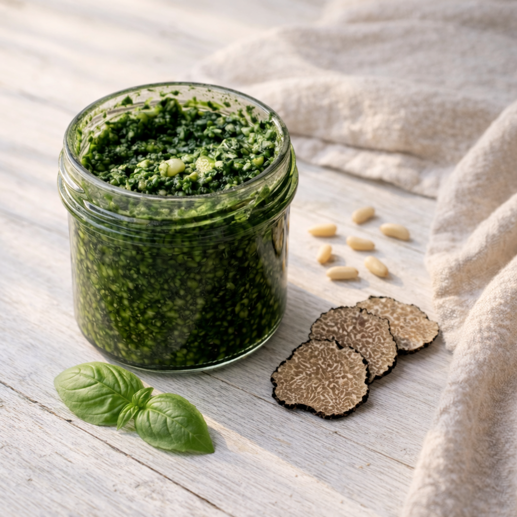 Масло белого трюфеля придаёт соусу изысканный, глубокий аромат и делает его особенным. Песто идеально подходит для пасты, ризотто, мяса, рыбы или просто как дополнение к свежему хлебу — для тех, кто ценит тонкие вкусы и натуральные продукты.