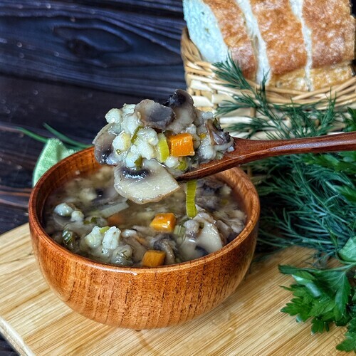 Перловая крупа, входящая в состав, является отличным источником клетчатки, которая способствует нормализации пищеварения и помогает поддерживать стабильный уровень сахара в крови. Грибы шампиньоны, известные своими питательными свойствами, содержат много витаминов и минералов, включая витамины группы B, которые важны для поддержания силы и энергии.