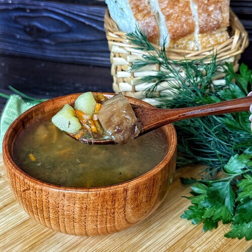 Состав: грибы белые, картофель, лук, морковь, зелень укропа и петрушки, масло растительное, вода, соль, перец.