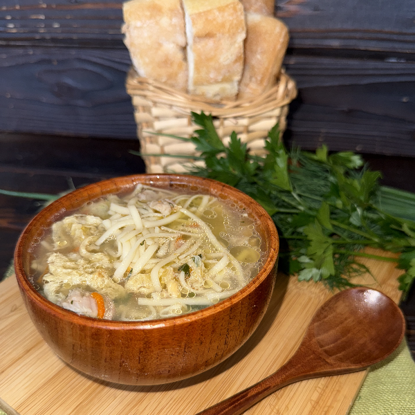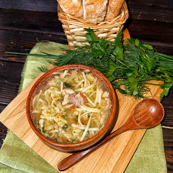 Куриная лапша Токмач - это классическое блюдо татарской кухни. Традиционный аппетитный наваристый суп на основе насыщенного целебного прозрачного бульона золотистого цвета из мяса птицы с бережно нарезанной вручную лапшой.