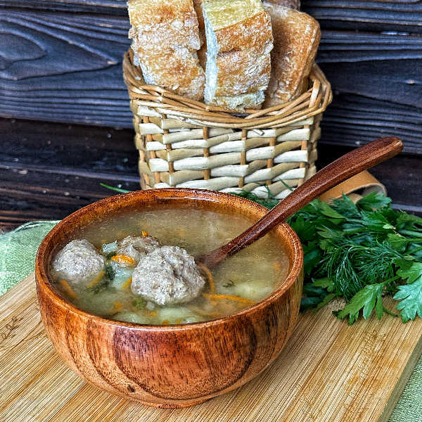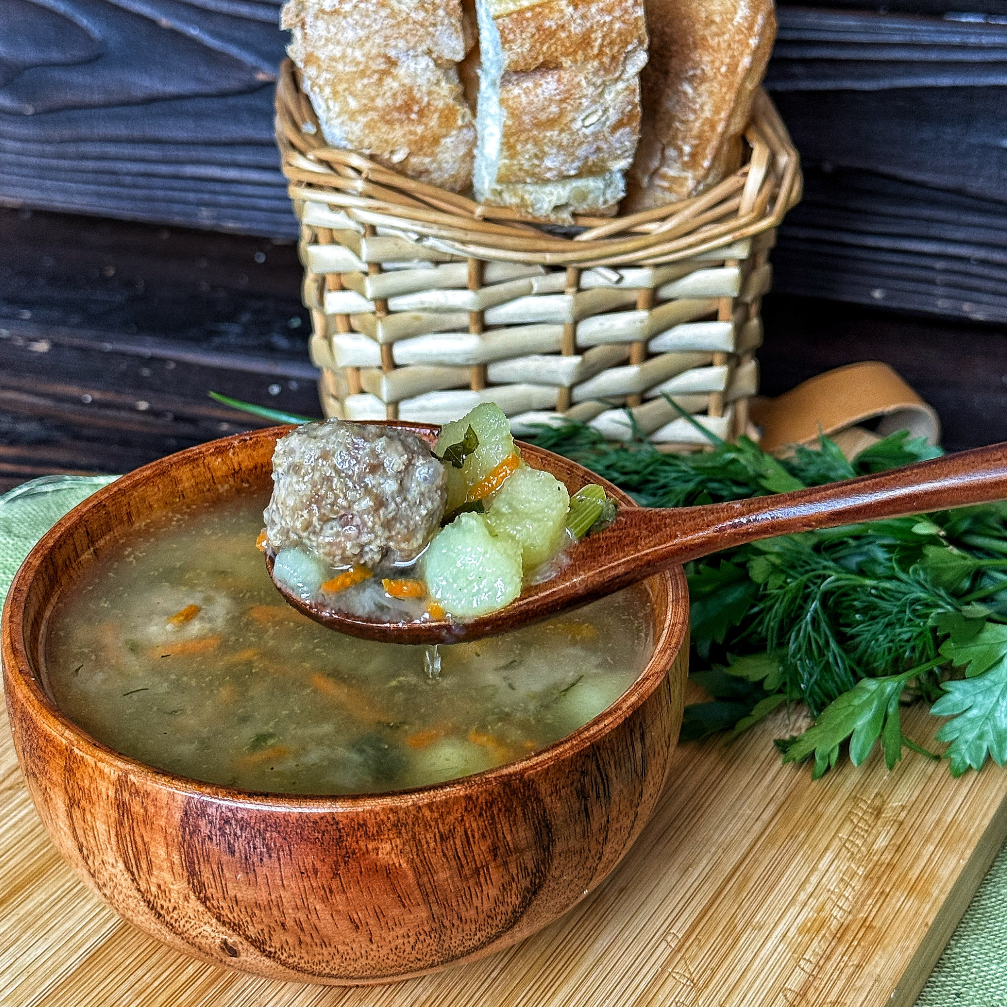 Суп с говяжьими фрикадельками предлагает сочетание свежих и натуральных ингредиентов. Говяжье мясо, картофель, овощи и зелень обеспечивают полное и питательное блюдо.