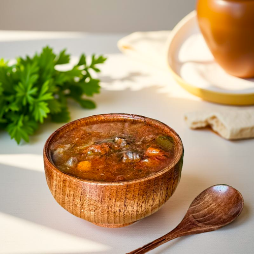 Состав: говядина, картофель, помидоры свежие, томатная паста, морковь, болгарский перец, петрушка, укроп, лук репчатый, масло подсолнечное, специи (соль, чеснок, лавровый лист, перец черный молотый)
