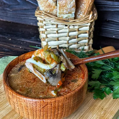 Суп также содержит многообразие морепродуктов, таких как кальмары и креветки, которые являются отличными источниками омега-3 жирных кислот. Эти полезные вещества способствуют улучшению обмена веществ и поддержанию здоровья сердечно-сосудистой системы.