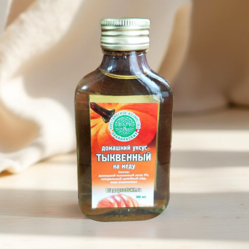 Уксус создан методом естественного брожения из спелой тыквы, натурального целебного мёда и чистой родниковой воды. В процессе ферментации образуется «уксусная матка» — живая культура, подтверждающая натуральность продукта. Приправа не пастеризуется, сохраняя все полезные свойства тыквы и мёда. Обладает мягким, сбалансированным вкусом с лёгкой сладостью и приятной кислинкой, идеально подходит для заправки осенних салатов и приготовления соусов.