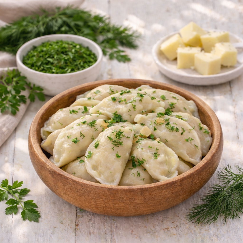 Вареники с сыром и зеленью созданы из тщательно отобранных ингредиентов. Начинка состоит из натуральных сыров сулугуни и адыгейского, куриного яйца и свежего укропа, что придаёт ей сбалансированный сливочный вкус с лёгкими травяными нотками. Тесто замешано на пшеничной муке высшего сорта, яйцах и чистой артезианской воде. Без использования искусственных улучшителей, консервантов и усилителей вкуса продукт сохраняет аутентичный домашний характер.