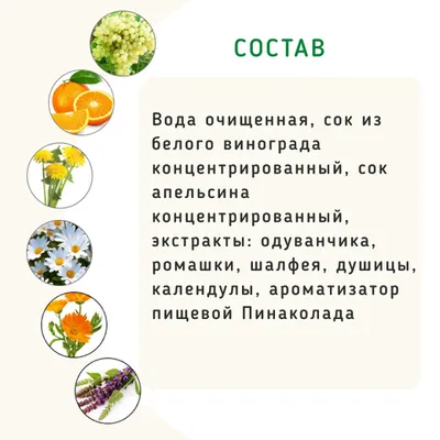 Состав: вода очищенная, сок из белого винограда концентрированный, сок апельсина концентрированный, экстракты: одуванчика, ромашки, шалфея, душицы, календулы, ароматизатор пищевой Пинаколада