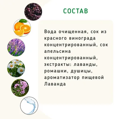 Состав: вода очищенная, сок из красного винограда концентрированный, сок апельсина концентрированный, экстракты: лаванды, ромашки, душицы, ароматизатор пищевой Лаванда