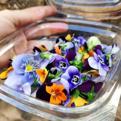 Съедобные цветы анютиных глазок (виолы) для украшения готовых блюд. В срезе 15 штук. Выращивается в закрытом органическом грунте без использования удобрений и химикатов в небольшом тепличном хозяйстве в Московской области.