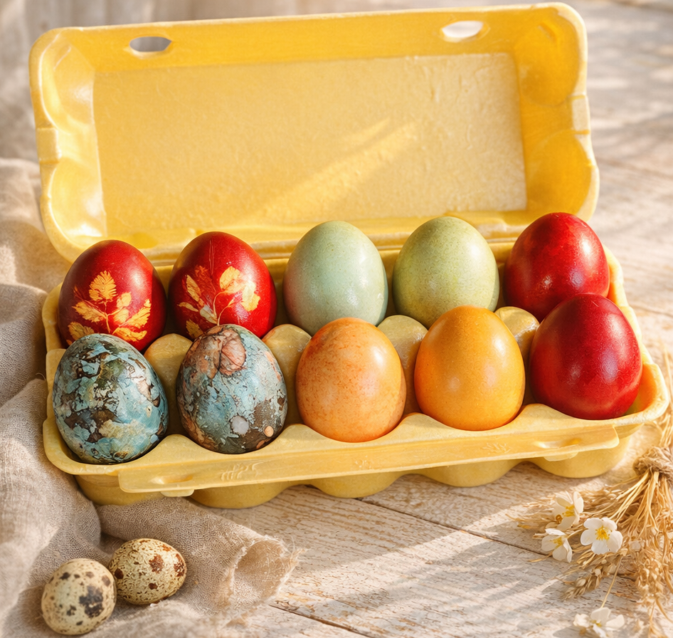 Домашние фермерские яйца, покрашенные семьей "Афлора". Мы взяли самые натуральные красители - луковую шелуху, куркуму, марену и каркадэ. Красивые и необычные яйца для Пасхи - лучший вариант для занятых.