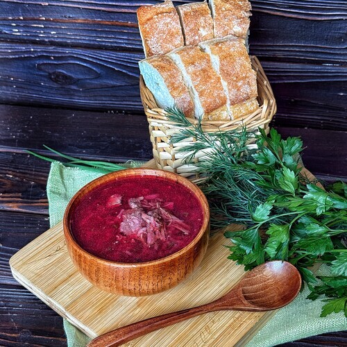 Состав: говядина, картофель, морковь, капуста белокочанная, свекла, лук репчатый, петрушка зелень, укроп зелень, томатная паста, масло подсолнечное растительное, специи (соль, чеснок, лавровый лист, перец черный молотый)
