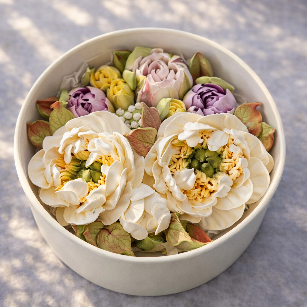 Букет из зефира «Пионы кремовые» — изящный сладкий подарок, который сочетает вкус натурального зефира и красоту цветочной композиции. Воздушные пионы из зефира аккуратно собраны в круглую коробку и выглядят как настоящий букет цветов.