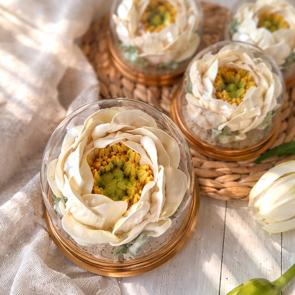 Эстетически выполненный десерт. Красивый внешний вид в форме пиона с тычинками украсит праздничный стол или станет идеальным подарком.