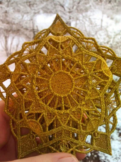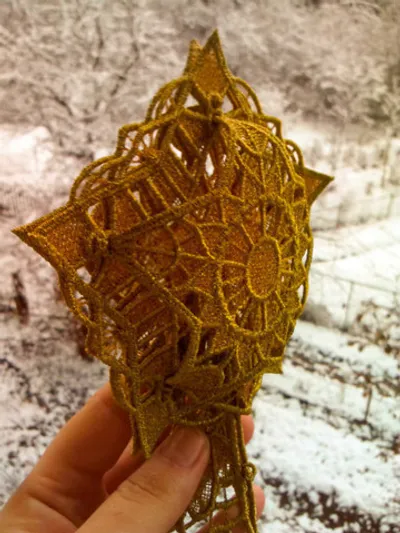 Очень красивая, кружевная объемная звезда, выполнена в технике машинной вышивки. Звезда сборно -разборная, что очень выгодно в плане хранения. Если есть необходимость, то ее можно разобрать, а на следующий Новый Год опять собрать.